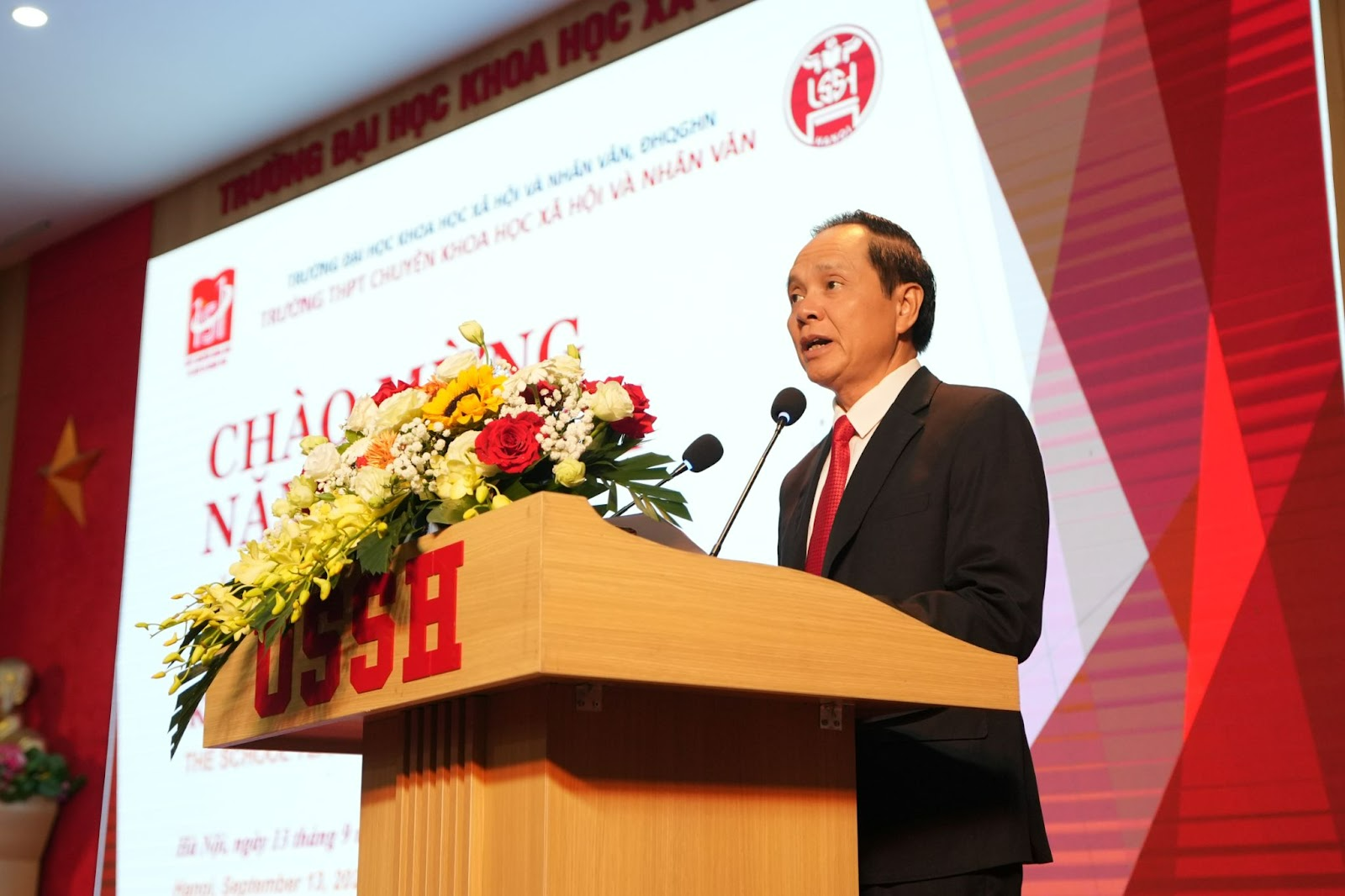 Trong không khí vui tươi của năm học mới, ông Nguyễn Huy Hùng - Đại diện hội Cha mẹ Phụ huynh học sinh cũng đã có đôi lời phát biểu, gửi lời chúc mừng đến trường THPT Chuyên KHXH&NV về những thành tựu trong năm học vừa qua và bày tỏ sự tin tưởng, đồng hành cùng Nhà trường trong hành trình giáo dục con em, đồng thời gửi gắm lời động viên, khích lệ các em học sinh khóa mới.