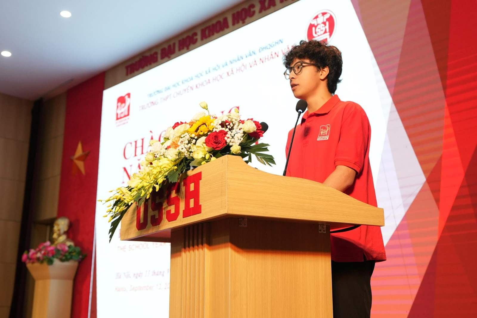 Khép lại phần khai mạc chào mừng, em Vũ Đăng Quang (học sinh lớp 12 Chuyên Ngữ văn 1) đã đại diện cho toàn thể học sinh Nhà trường chia sẻ về những trải nghiệm học tập ở ngôi trường Chuyên, đồng thời bày tỏ niềm tự hào khi được khoác trên mình màu áo của trường THPT Chuyên KHXH&NV.